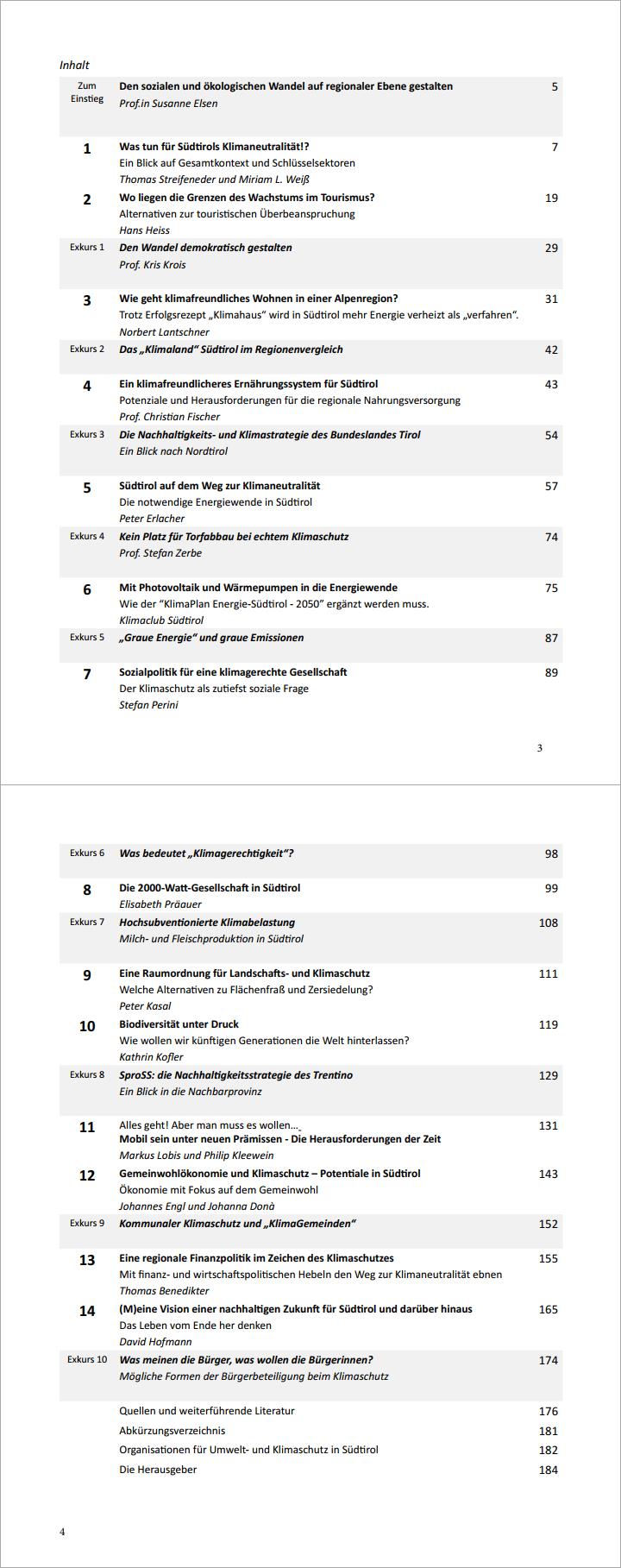 Roter Faden dieser Publikation ist somit die Überlegung, wie Klimaneutralität in Südtirol wirklich erreicht werden könnte und wie der Klimaschutz konsequenter gefasst werden müsste, wenn wir bis 2050 in einer emissionsarmen oder gar CO2-freien Gesellschaft leben wollen. Mehr als 20 Fachleute befassen sich in 16 Einzelbeiträgen mit einzelnen Politikfeldern. Zuerst werfen Thomas Streifeneder und Miriam Weiß von der EURAC im Abschnitt „Was tun für Südtirols Klimaneutralität“ einen Blick auf den Gesamtkontext; dann geht Hans Heiss auf die Grenzen des Tourismus ein; Kris Krois überlegt, wie die ökosoziale Transformation Hand in Hand mit demokratischer Beteiligung zu gehen hat; Norbert Lantschner hat sehr viel nachgedacht über klimafreundliches Wohnen; ganz bedeutend für den Klimaschutz ist das Nahrungsmittelversorgungssystem, das Prof. Christian Fischer analysiert. Zwei Beiträge befassen sich mit der Südtiroler Energiepolitik und Energiewende, nämlich der Energieexperte Peter Erlacher und der Klimaclub Südtirol. Stefan Perini thematisiert den Klimaschutz als zutiefst soziale Frage. Elisabeth Präauer vom Terra Institute Brixen geht der Frage nach, wie wir uns als Einzelne einer „2000-Watt-Gesellschaft“ annähern können. Prof. Stefan Zerbe weist auf die Bedeutung der Moore und die Gefahr des Torfabbaus für den Klimaschutz hin. Die Biologin Kathrin Kofler erläutert den Zusammenhang zwischen Klimaschutz und Schutz der Artenvielfalt. Peter Kasal hat ganz konkrete Vorstellungen von einer Raumordnung mit weniger Flächenfraß, genauso Markus Lobis und Philip Kleewein von einer klimafreundlichen Mobilität im umfassenden Sinn. Johannes Engl und Johanna Donà, die auch Mitherausgeber sind, erläutern, was Gemeinwohlökonomie bedeutet im Allgemeinen und speziell für den Klimaschutz: Gemeinwohlökonomie schließt Klimaschutz ein, steht aber auch für eine humane, fairere Form des Wirtschaftens. Dann einige Vorschläge zur Finanzpolitik im Zeichen des Klimaschutzes von Thomas Benedikter und ein heiter-philosophischer Abschluss vom Physiker und Neurowissenschaftler David Hofmann. Abgerundet wird der Band durch eine Einführung von Prof.in Susanne Elsen und verschiedene weitere für die Klimaschutzpolitik in Südtirol relevante Aspekte.